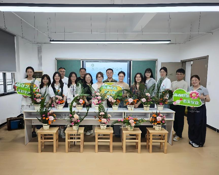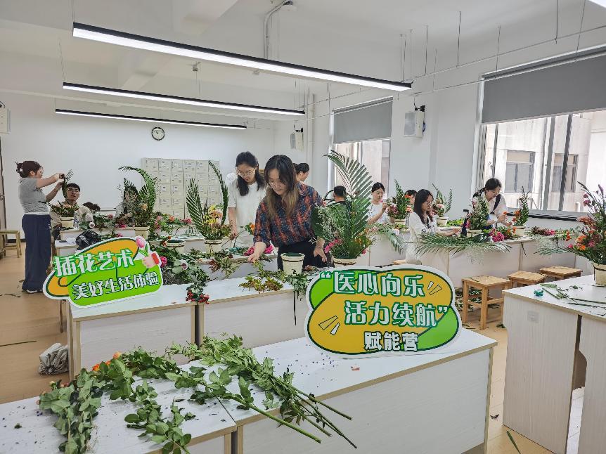 为传递社会关爱,提升职业幸福感,6月22日,我校组织资深花艺师资团队走进常州市第一人民医院教培处,为刚踏上工作岗位的医护工作者精心举办了一场主题为“医心向乐 活力续航 减压赋能”的艺术插花培训活动。